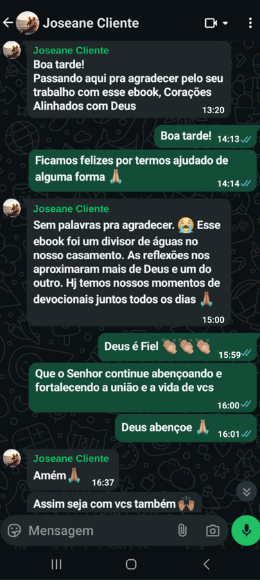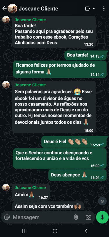 Corações Alinhados com Deus é um devocional transformador para casais, com 365 mensagens diárias que vão fortalecer a fé, a união e o amor entre vocês ao longo de todo o ano. Cada dia traz uma reflexão inspirada na Palavra de Deus, ajudando a alinhar o coração de ambos ao coração do Senhor, aprofundar a intimidade espiritual e fortalecer o relacionamento. Ideal para casais que desejam caminhar juntos no propósito divino, experimentando paz, cumplicidade e crescimento em Deus todos os dias.